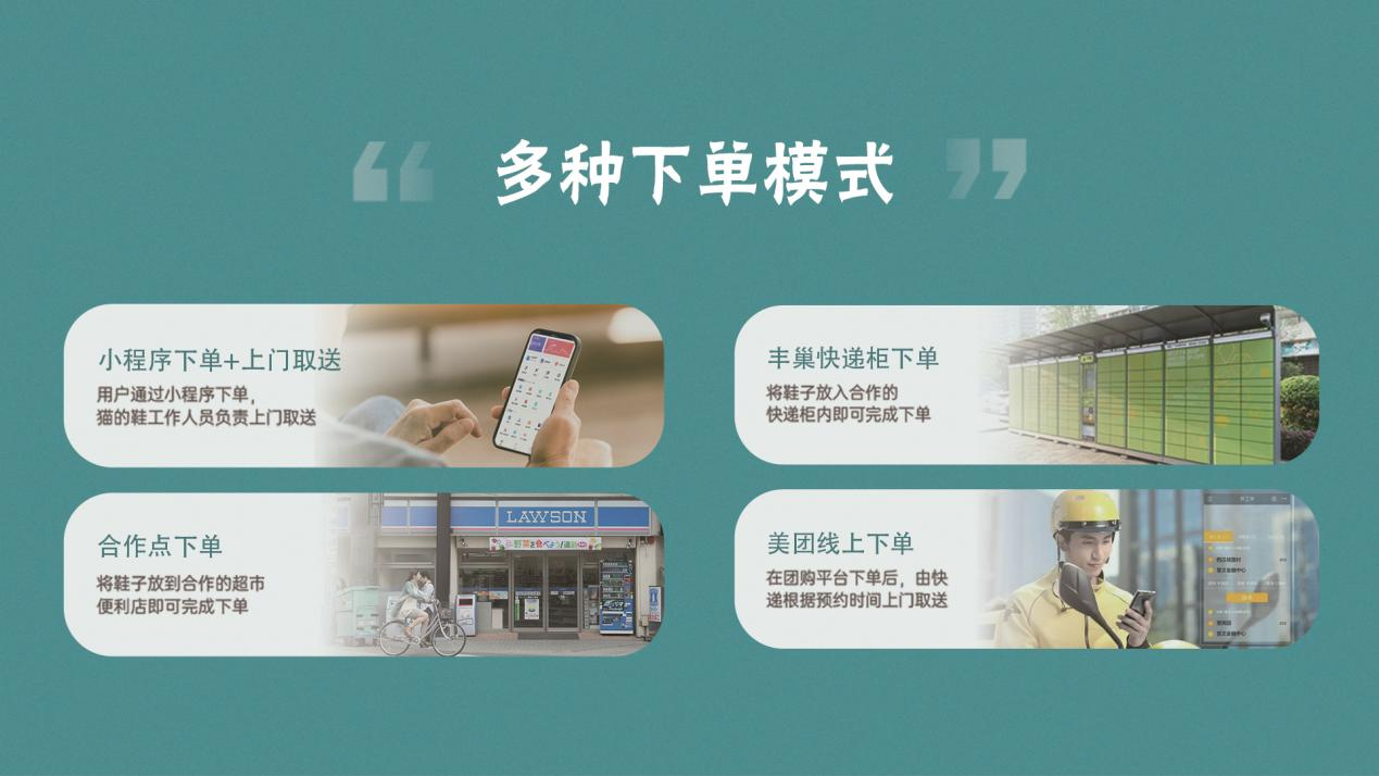客户可以选择在猫的鞋™小程序、美团等线上平台下单,也可以直接把鞋放在合作的快递驿站、丰巢快递柜、超市等地方,就会有工作人员将鞋取回送入工厂进行专业清洗。为了满足客户的时效需求,猫的鞋™还推出了“24H急速焕新服务”,将在24小时内将清洗完毕的鞋子护送上门。