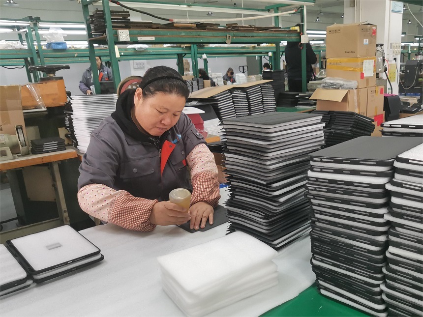 走进深圳市深蓝信科技发展有限公司的生产车间,伴随机器轰鸣,一块块皮质材料被迅速裁切、压制成型。工人们配合着机械臂,熟练地完成粘合、缝制等工序,一个个外形美观的数码产品皮套迅速走下生产线。